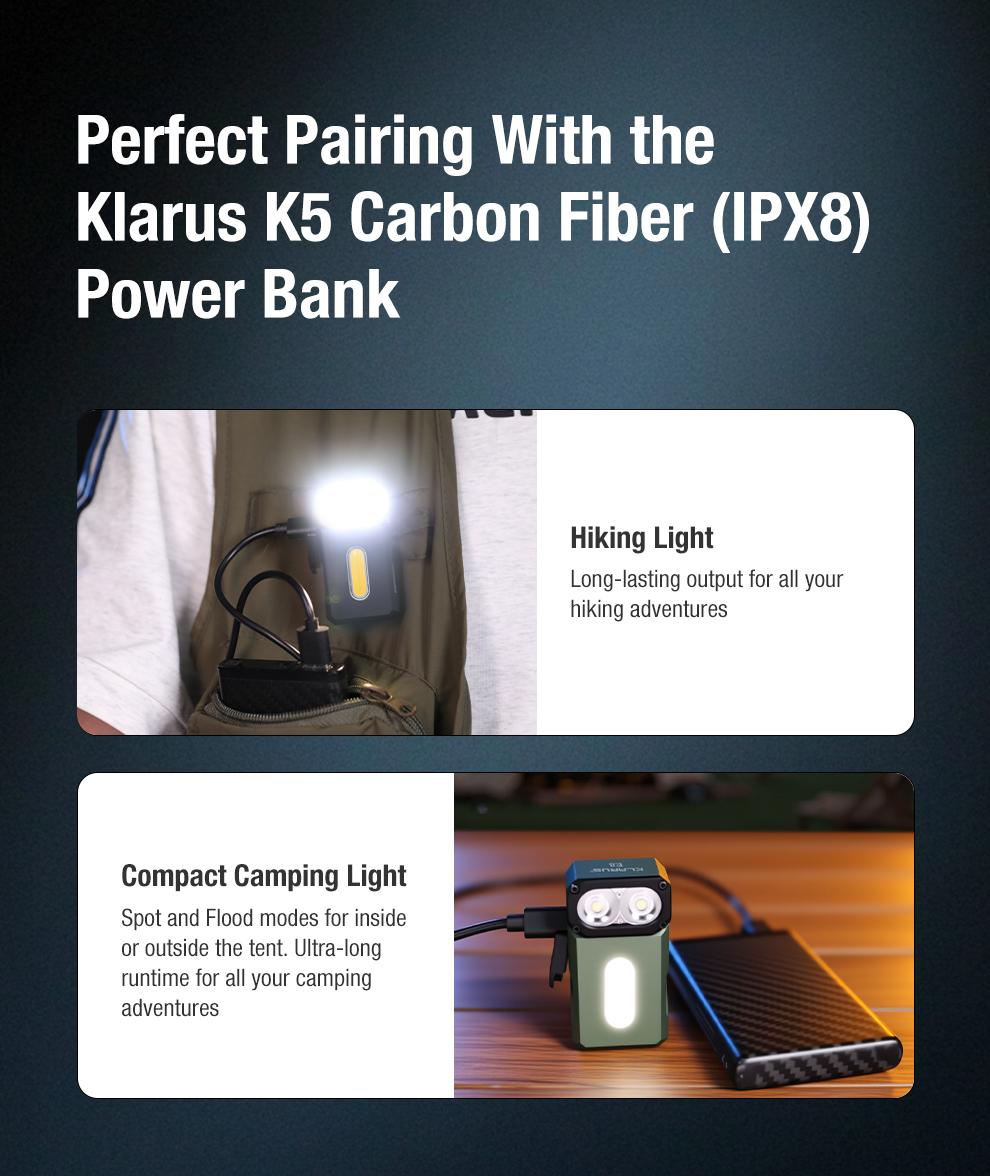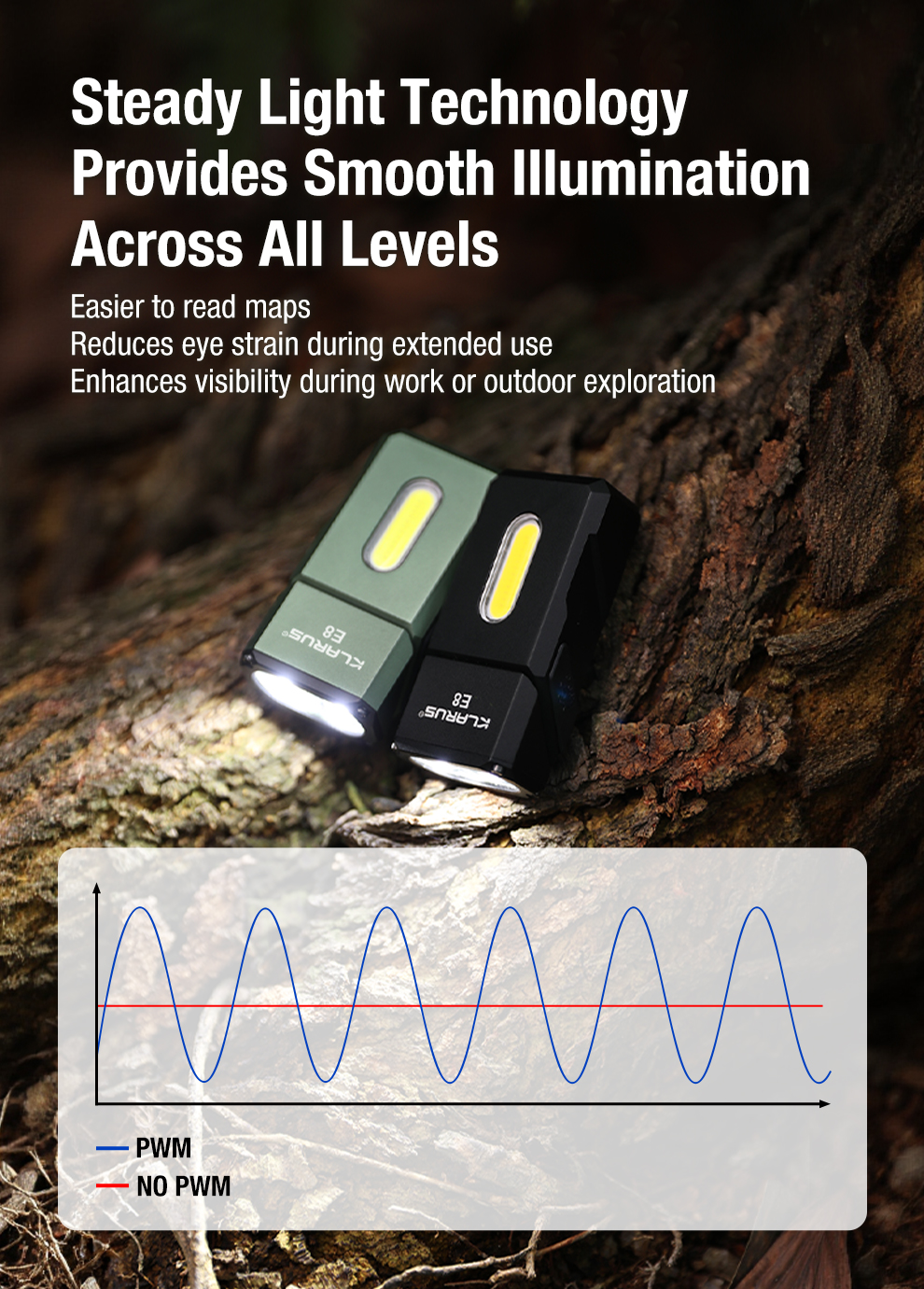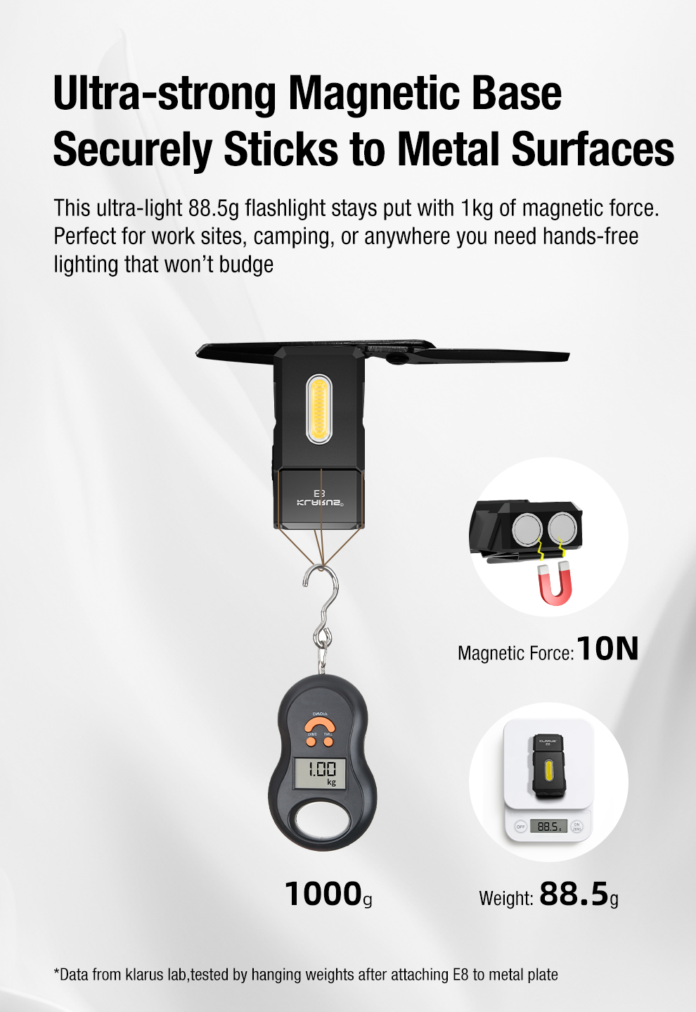 KLARUS E8; 1000 lümen spot ışığı ve 300 lümen geniş açılı flood ışığıyla hem uzak mesafede hem de yakın alan aydınlatmasında olağanüstü performans sunar.