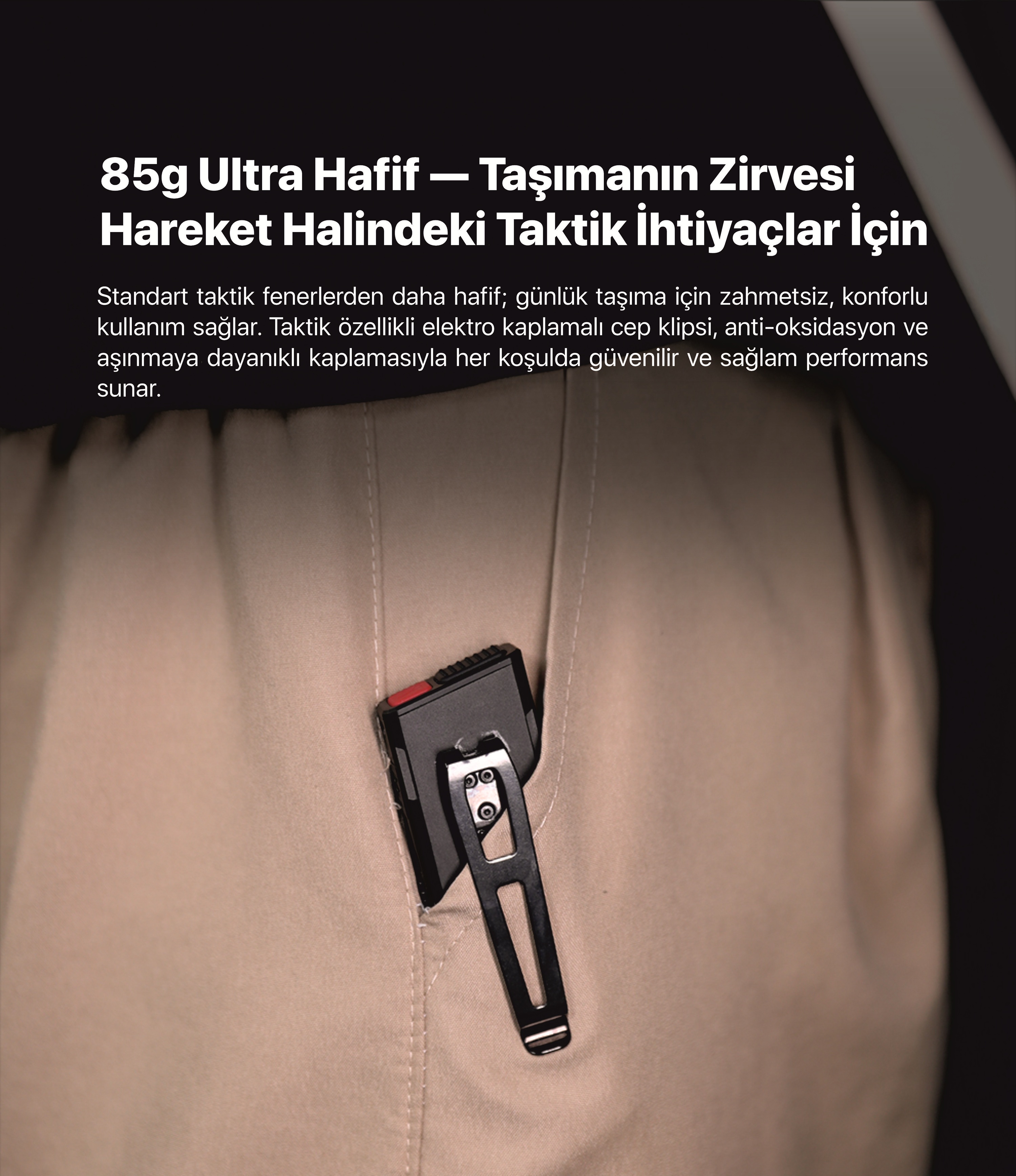 Yalnızca 85 g ağırlığında ve 14,5 mm inceliğindeki FlatTac X2, ceplere, EDC setlerine ve görev donanımlarına kusursuz biçimde uyum sağlar.