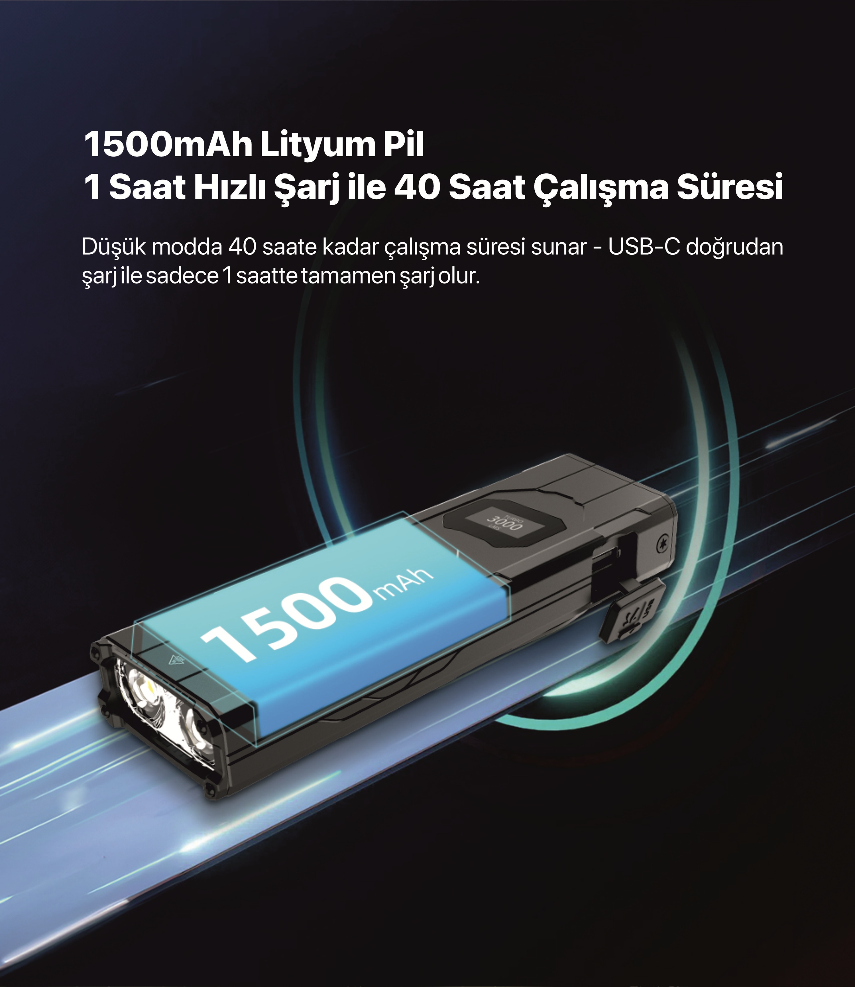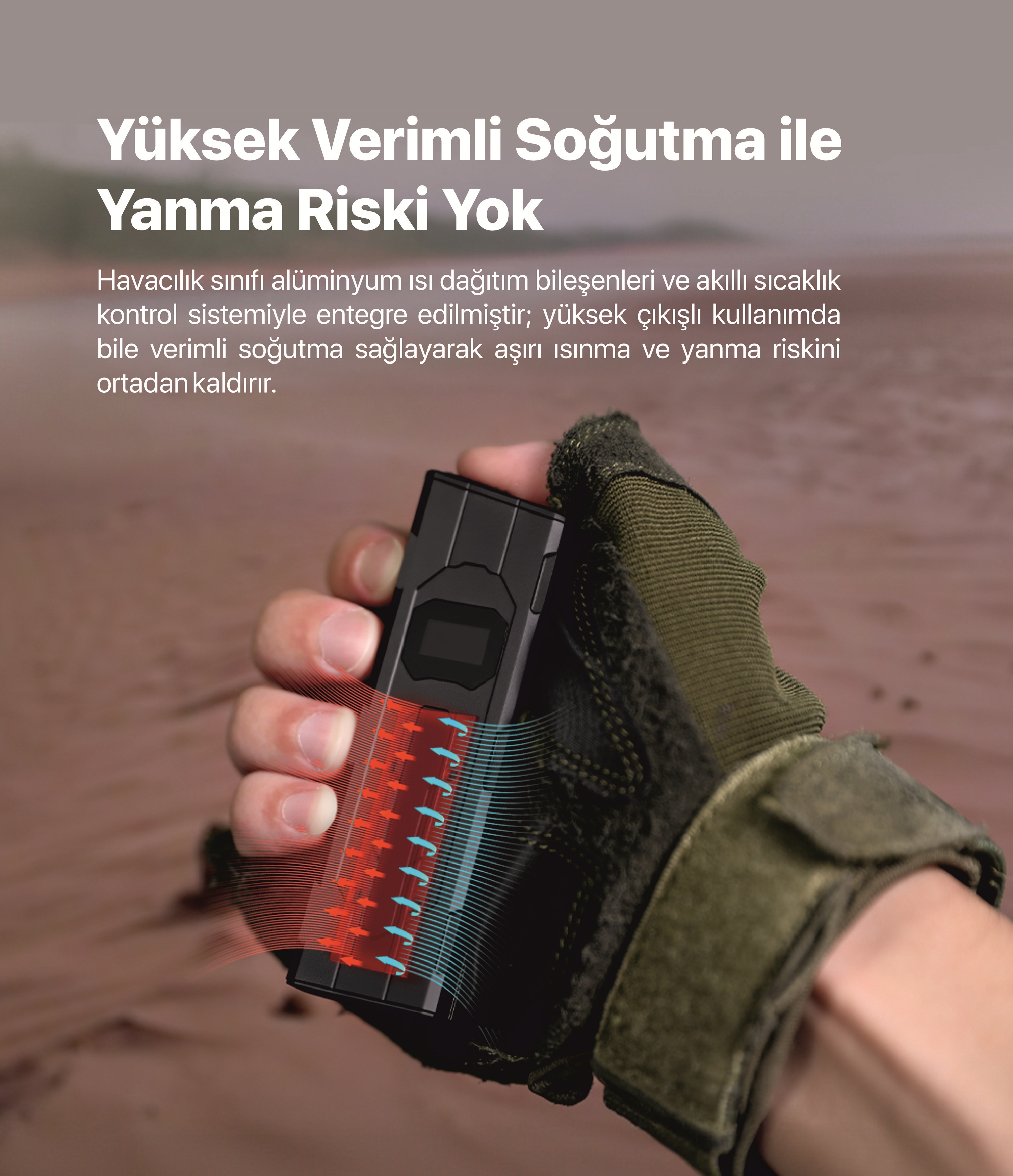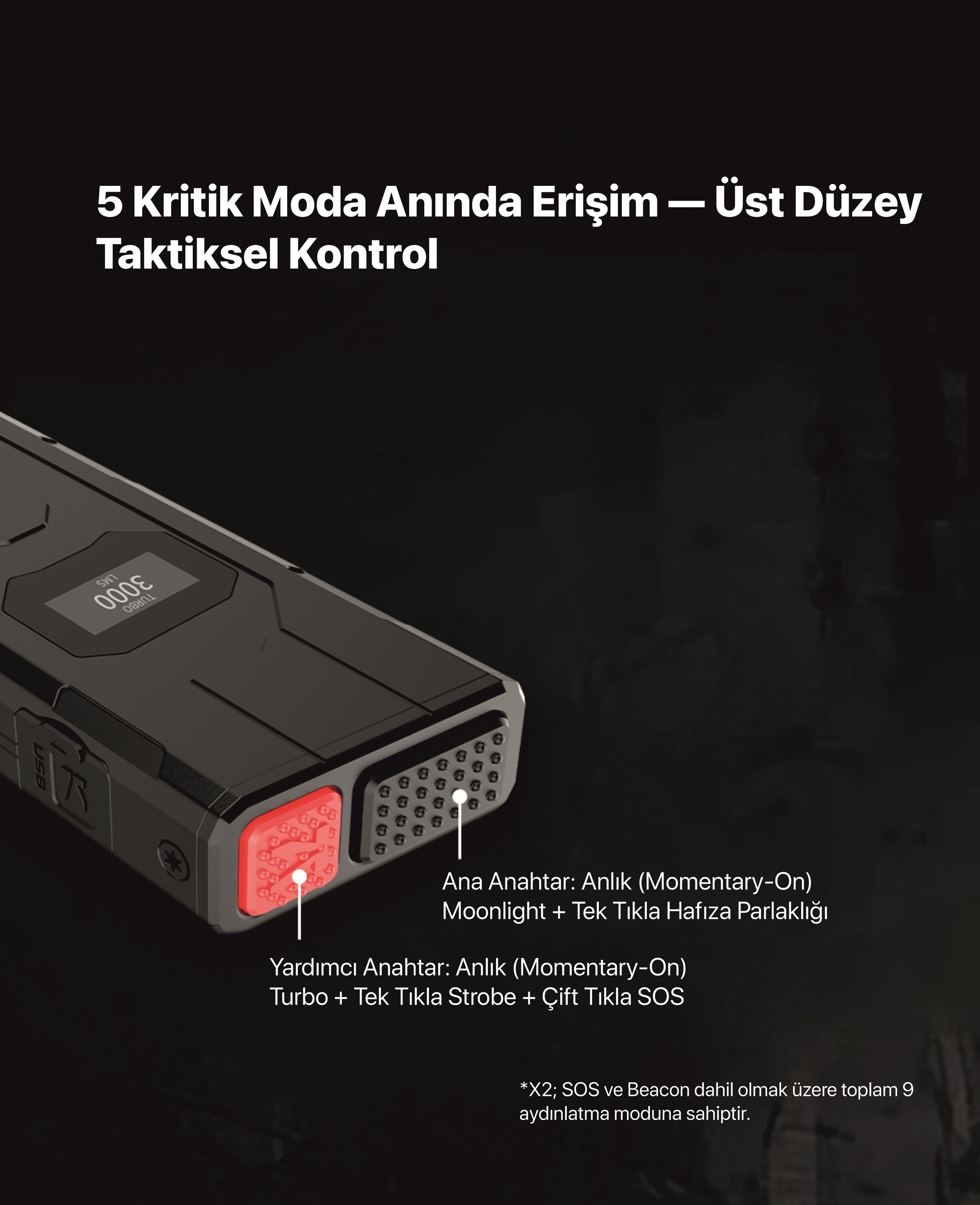 Akıllı OLED ekran, pil, mod ve sıcaklık bilgisini net biçimde gösterir; çift akıllı düğme sistemiyle Turbo, Strobe, Moonlight, Memory ve SOS modları arasında tek elle geçiş yapabilirsiniz.