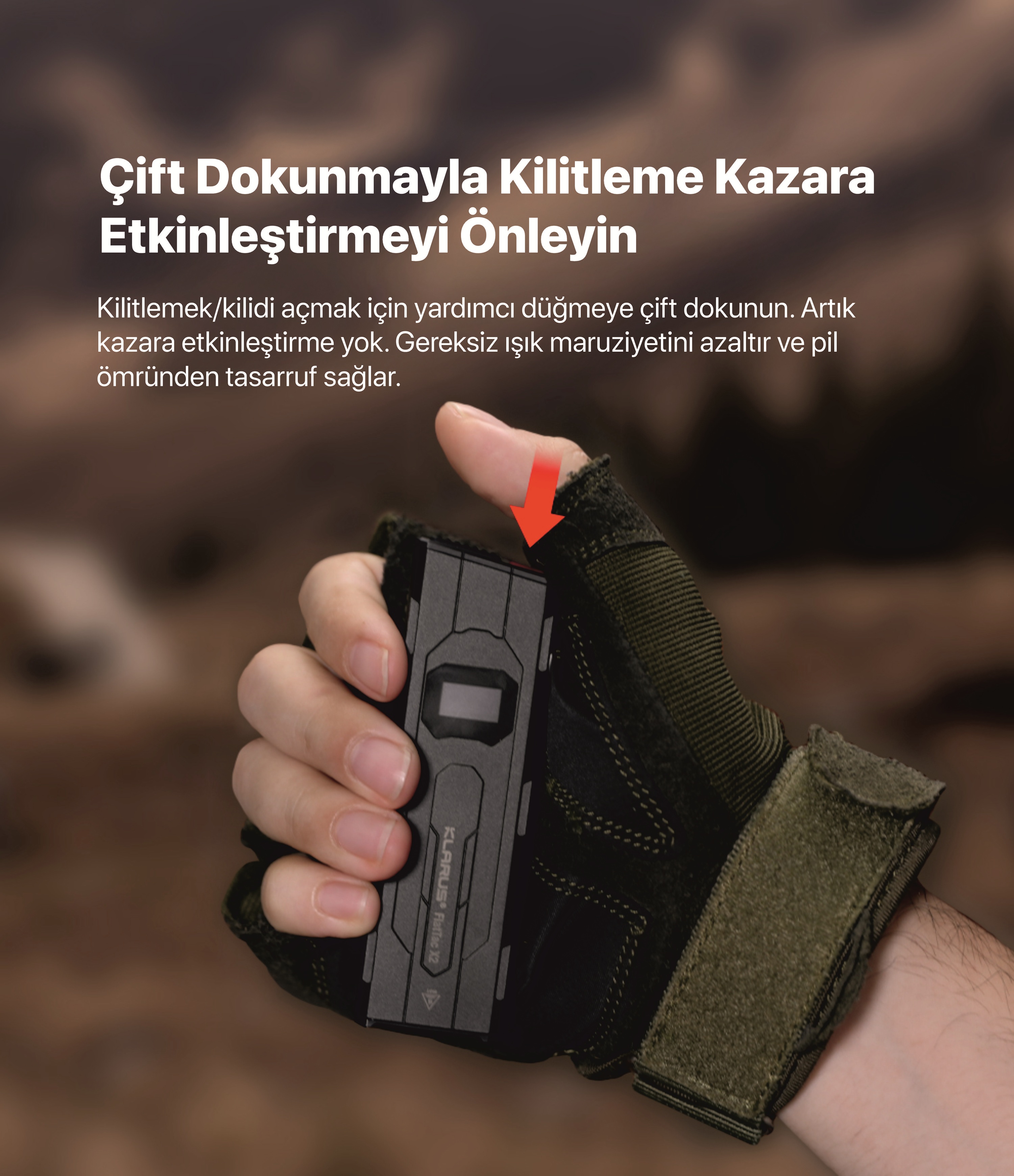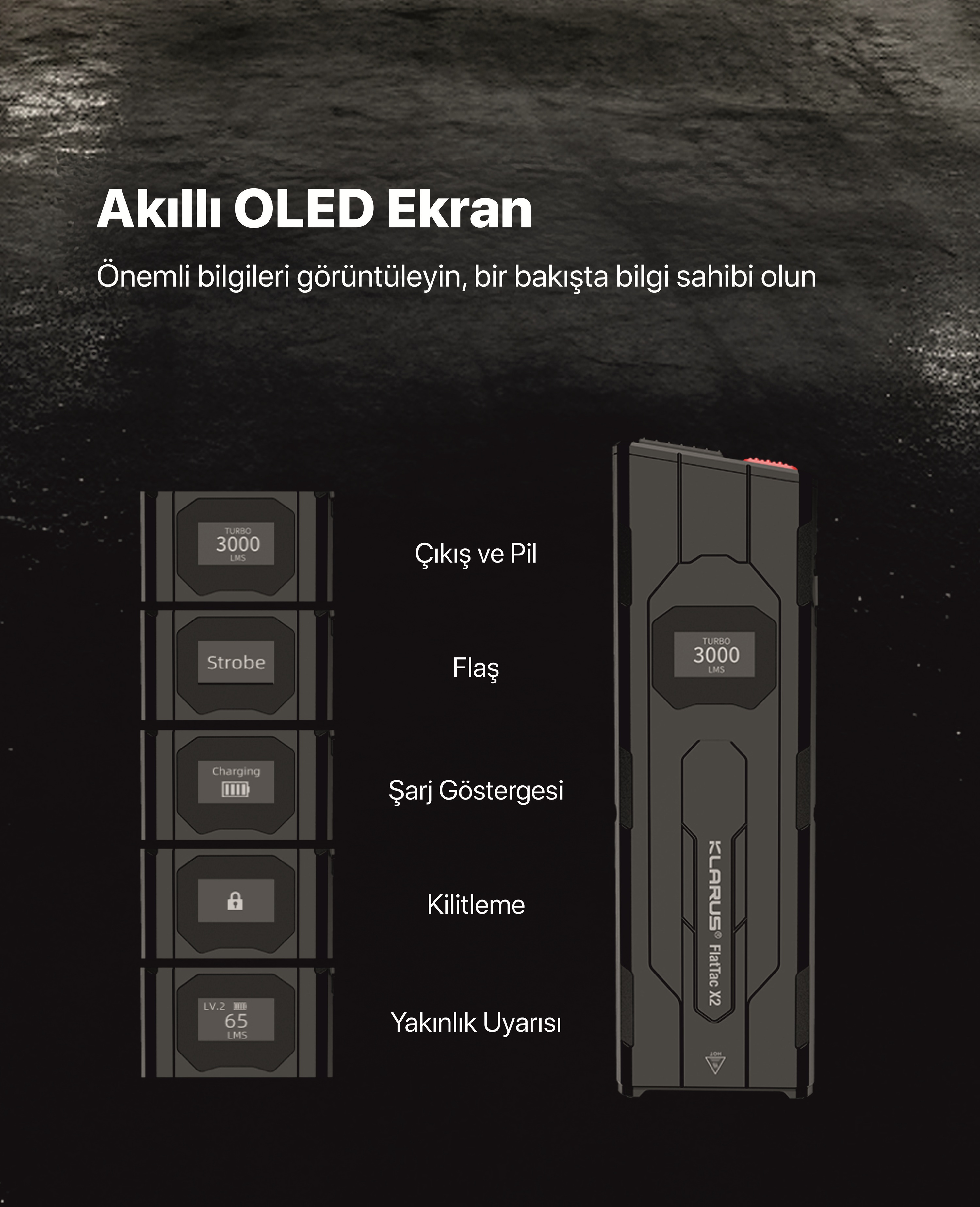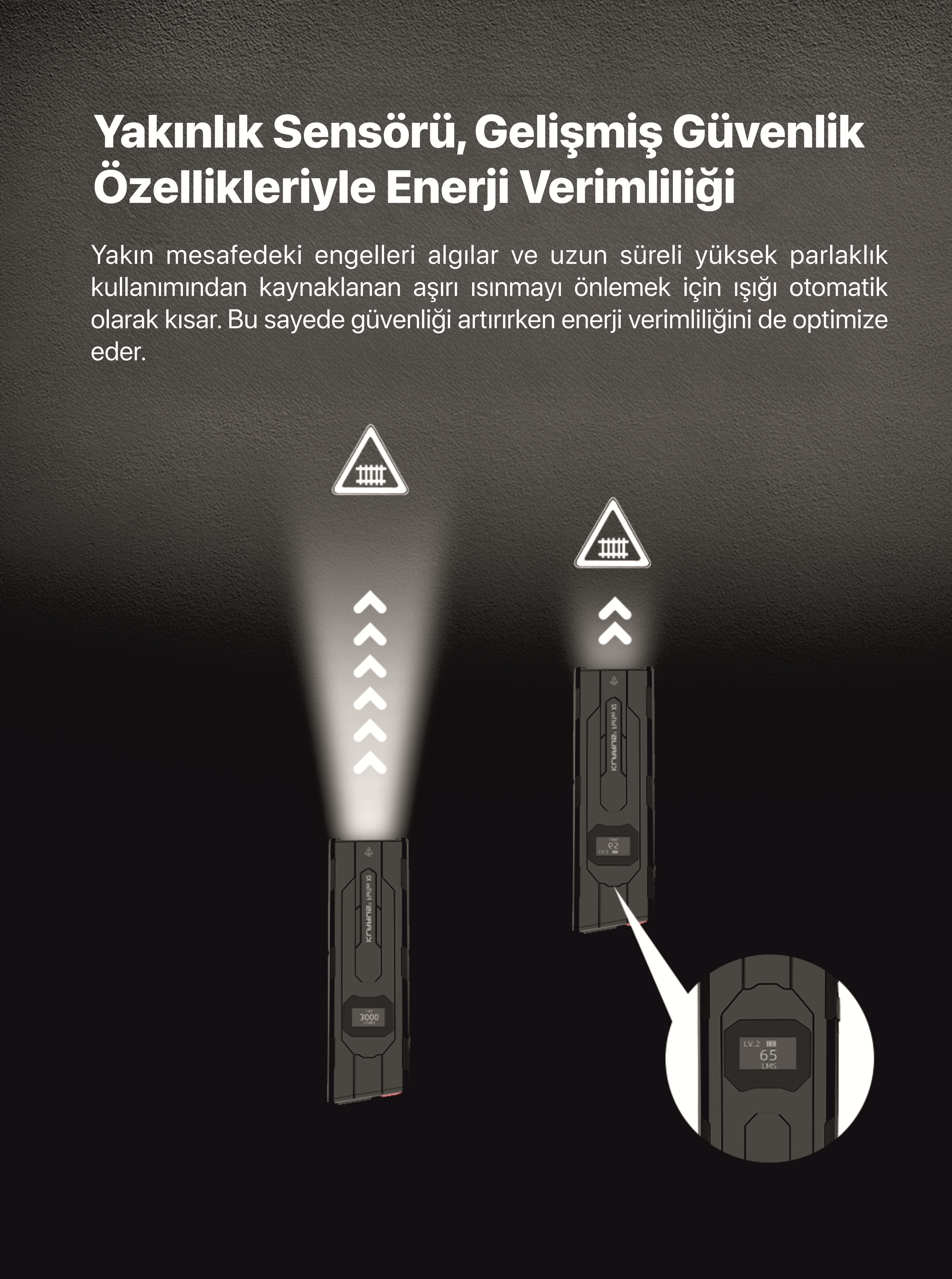 Akıllı OLED ekran, pil, mod ve sıcaklık bilgisini net biçimde gösterir; çift akıllı düğme sistemiyle Turbo, Strobe, Moonlight, Memory ve SOS modları arasında tek elle geçiş yapabilirsiniz.