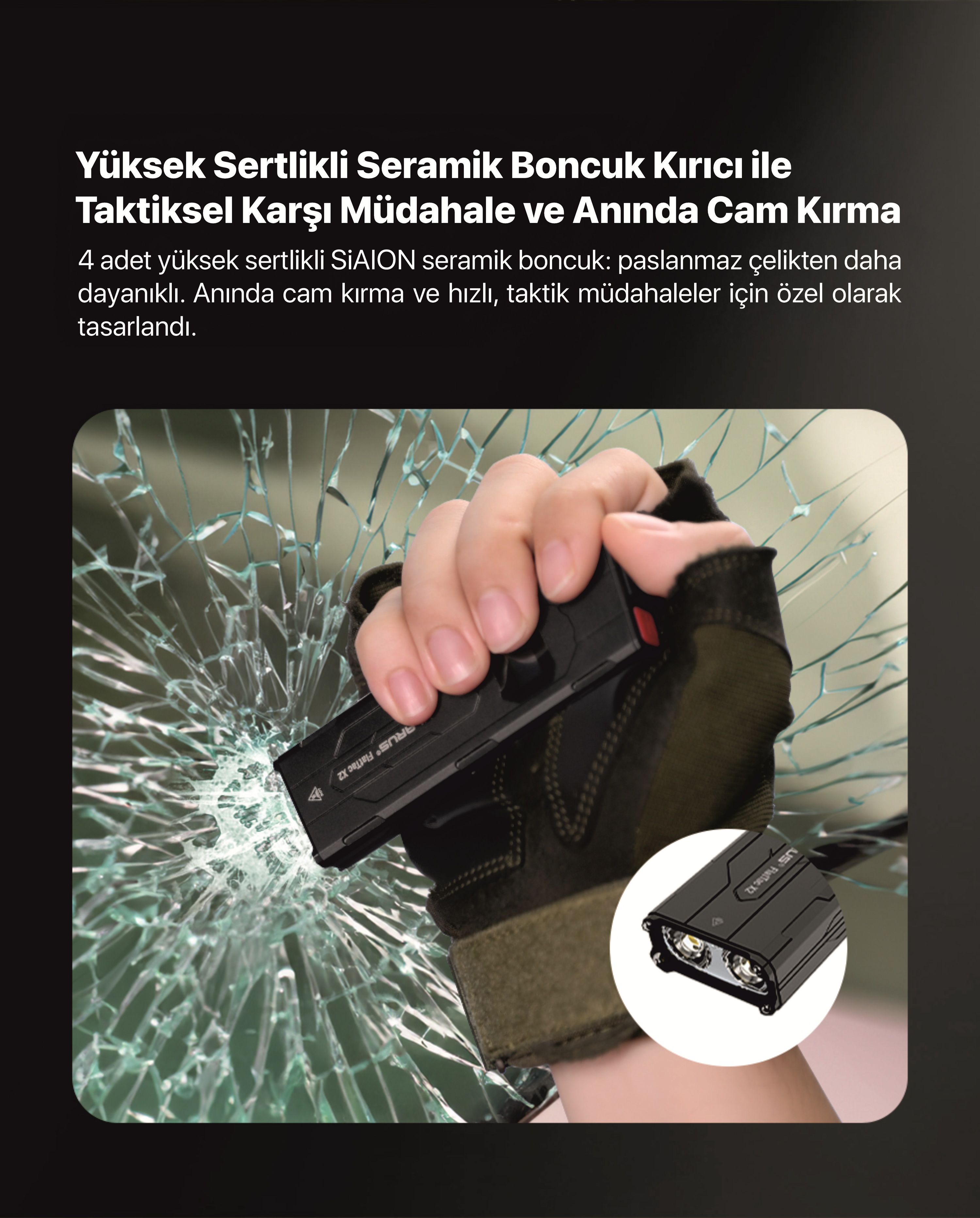Taktikal seramik bezel acil durumlarda cam kırmak için tasarlanmıştır.