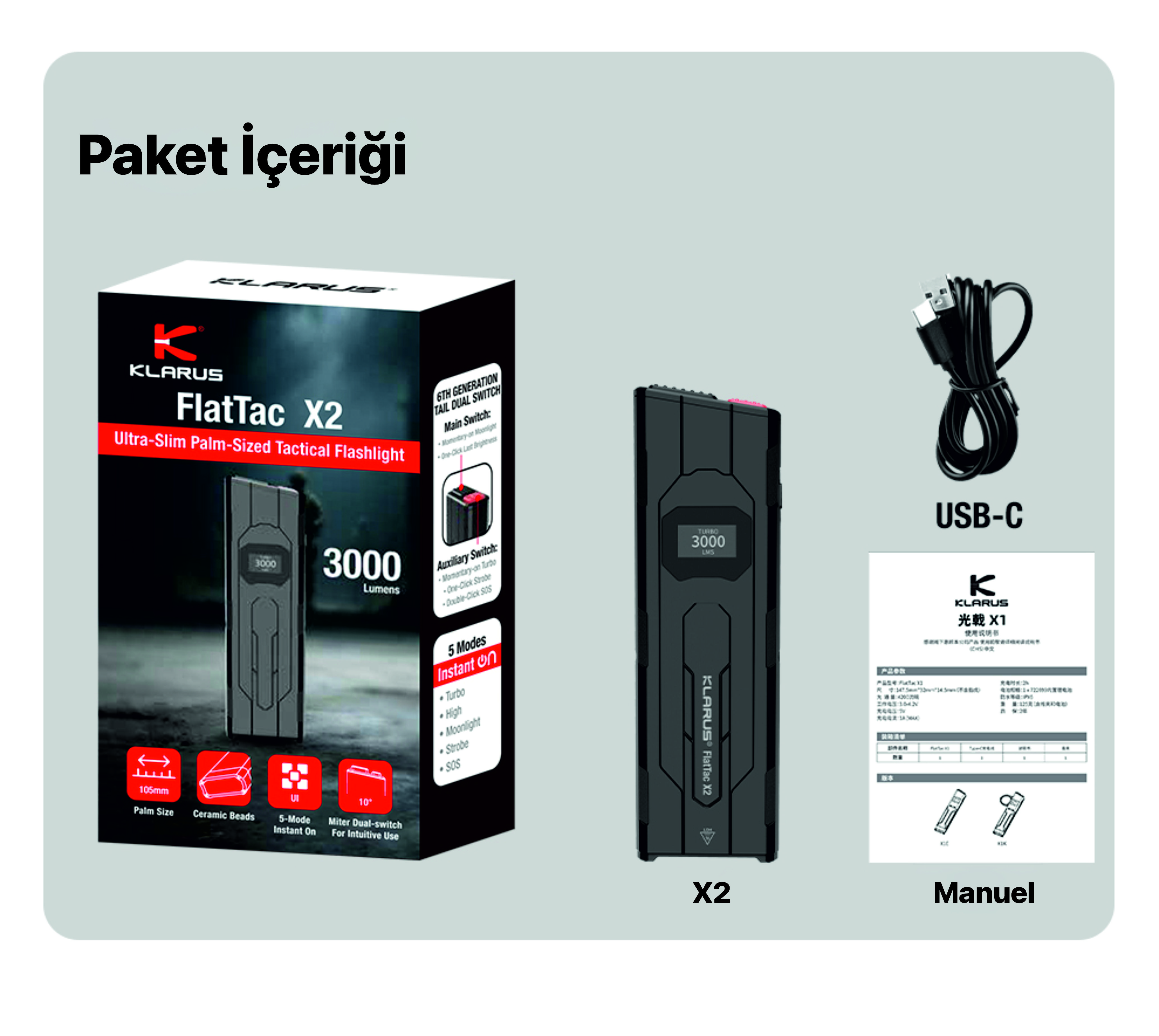| Kutu İçeriği | FlatTac X2 fener ×1, USB-C kablo ×1, klips ×1, kılavuz ×1 |