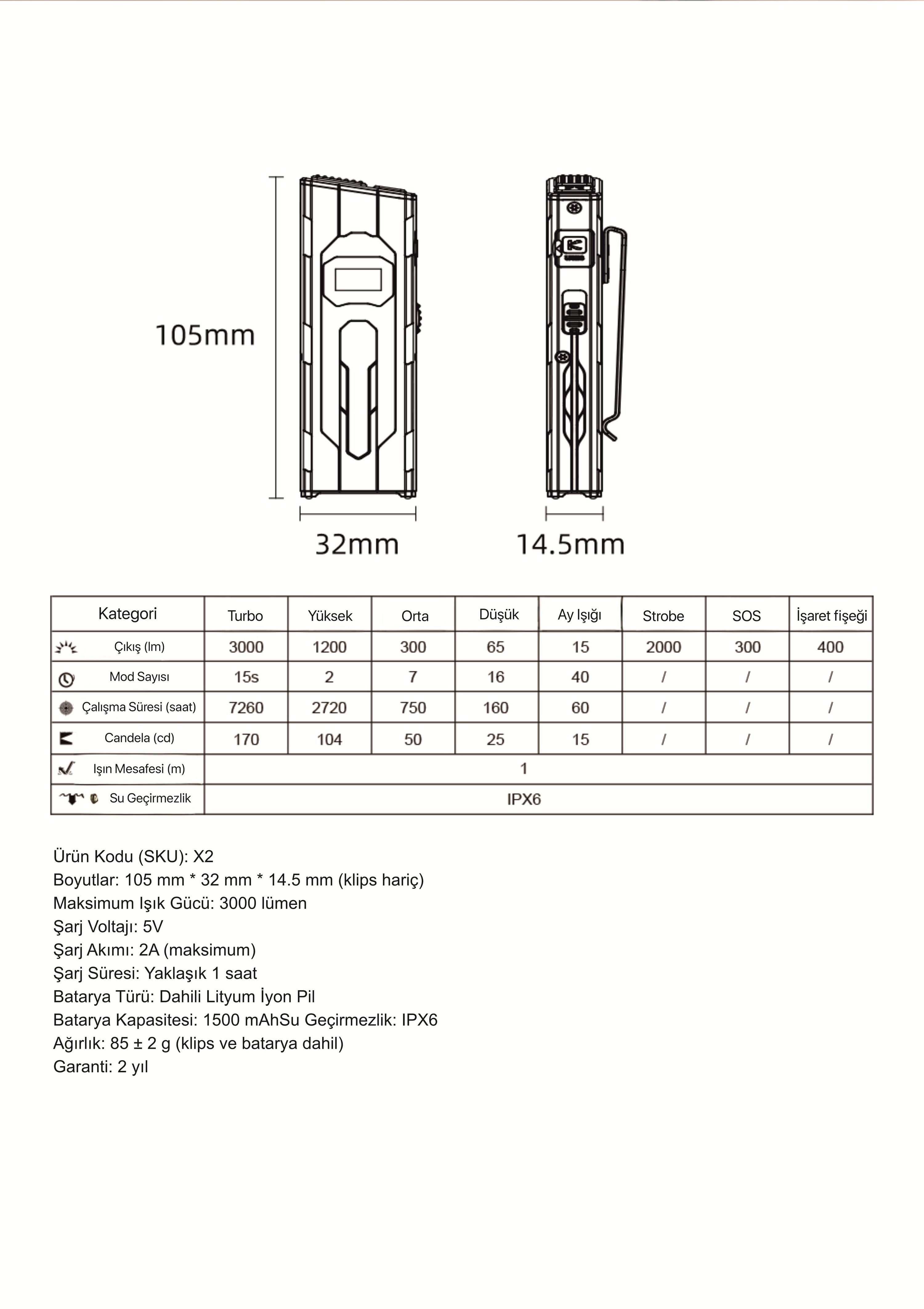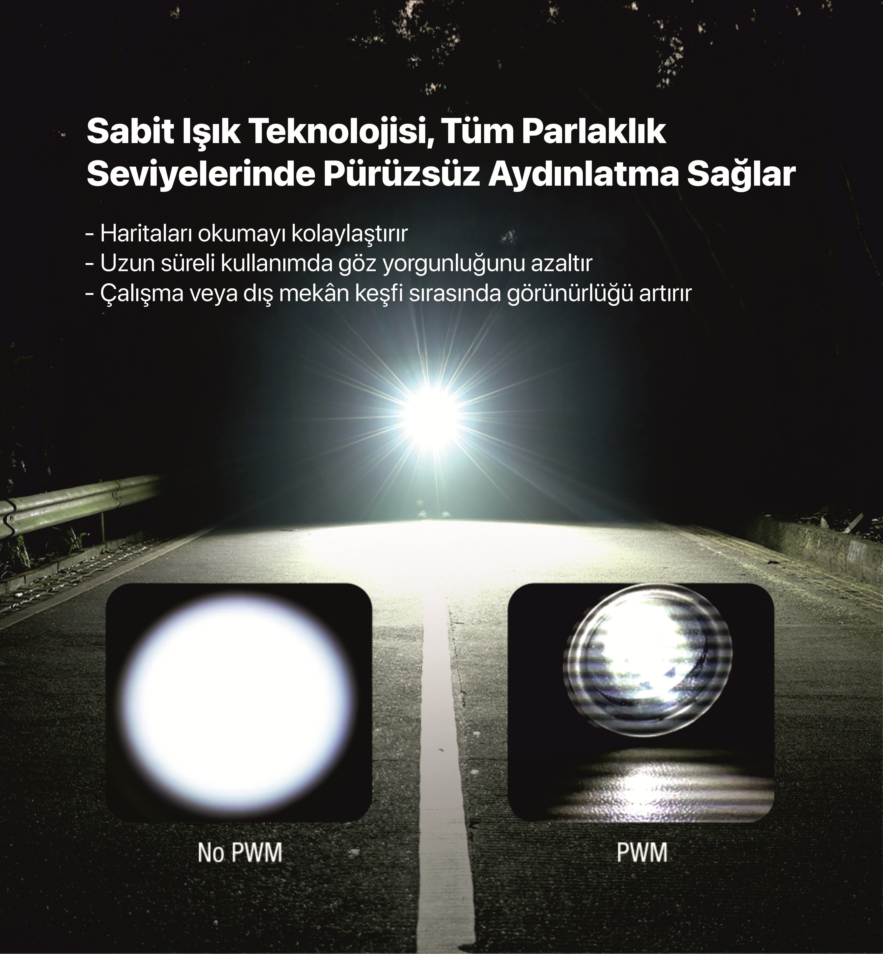 | Işık Modları | Turbo, High, Moonlight, Strobe, SOS, Memory |