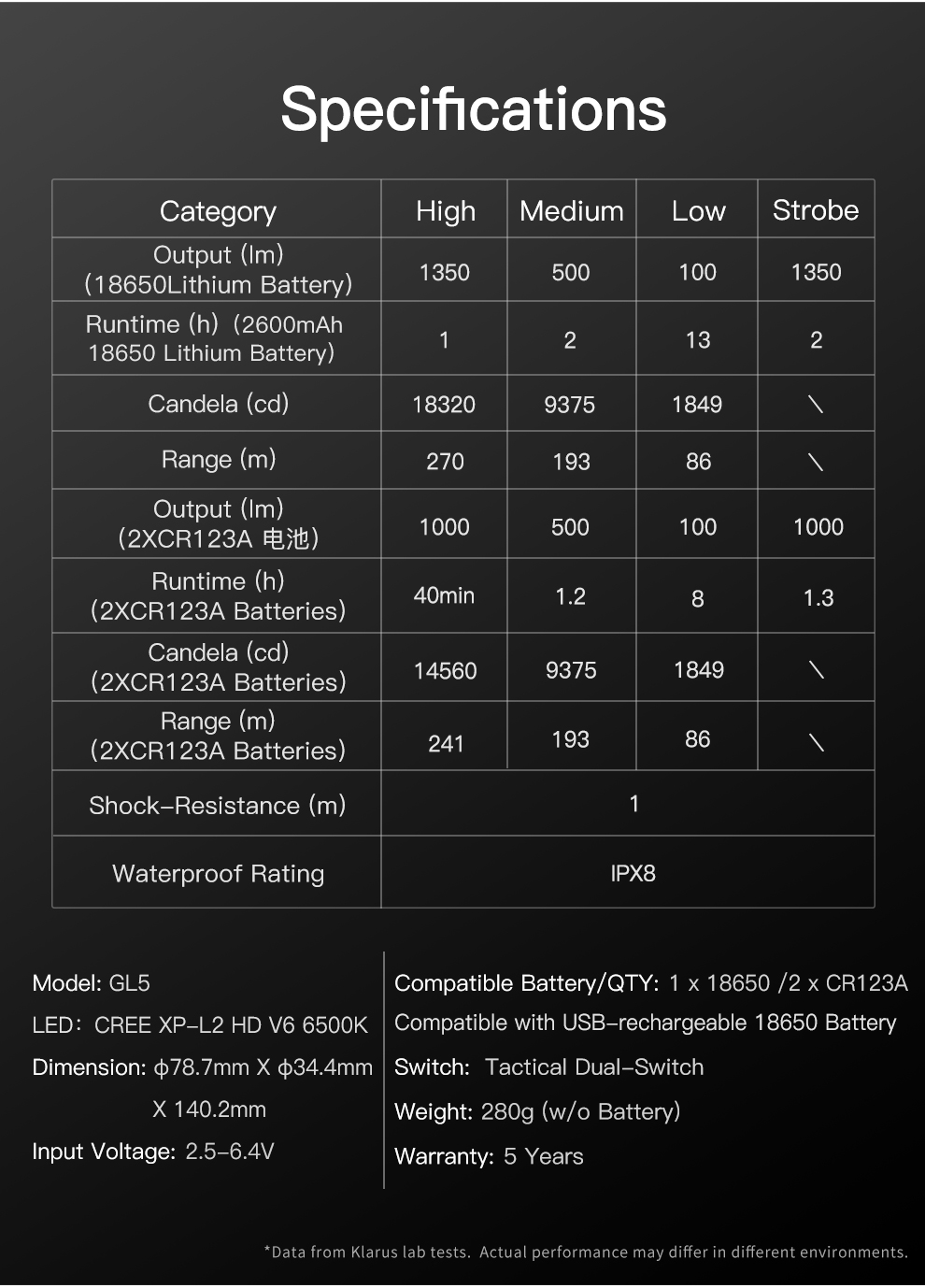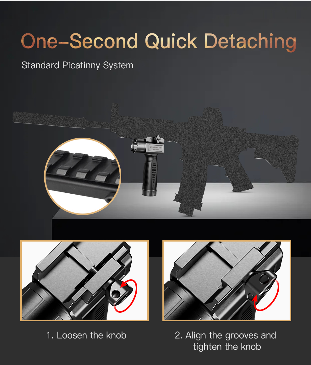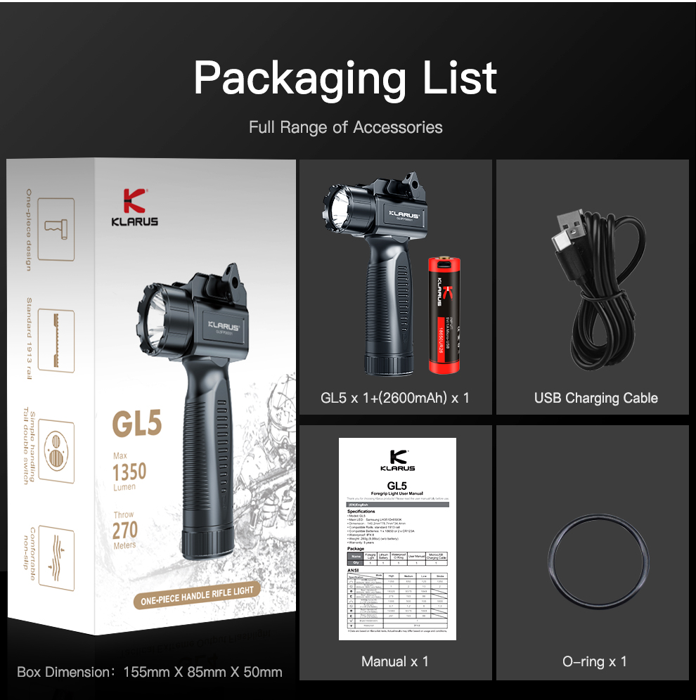 Klarus GL5 Dikey Taktik Tutamaklı Tüfek Feneri, profesyonel atış platformları ve savunma uygulamaları için geliştirilmiş yüksek performanslı bir dikey tutamaktır. Entegre LED aydınlatma sistemi ve askeri standartlarda sert anodize gövdesi sayesinde, düşük ışık koşullarında üstün görüş ve kontrol sağlar. Picatinny uyumlu hızlı montaj yapısı, kullanıcıya güvenilir ve pratik kullanım sunarken, sağlam gövde yapısı geri tepme ve titreşim altında maksimum dayanıklılık sağlar.