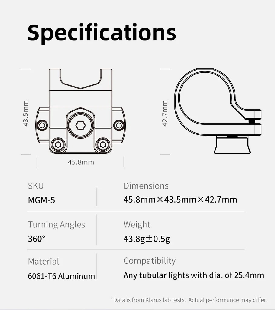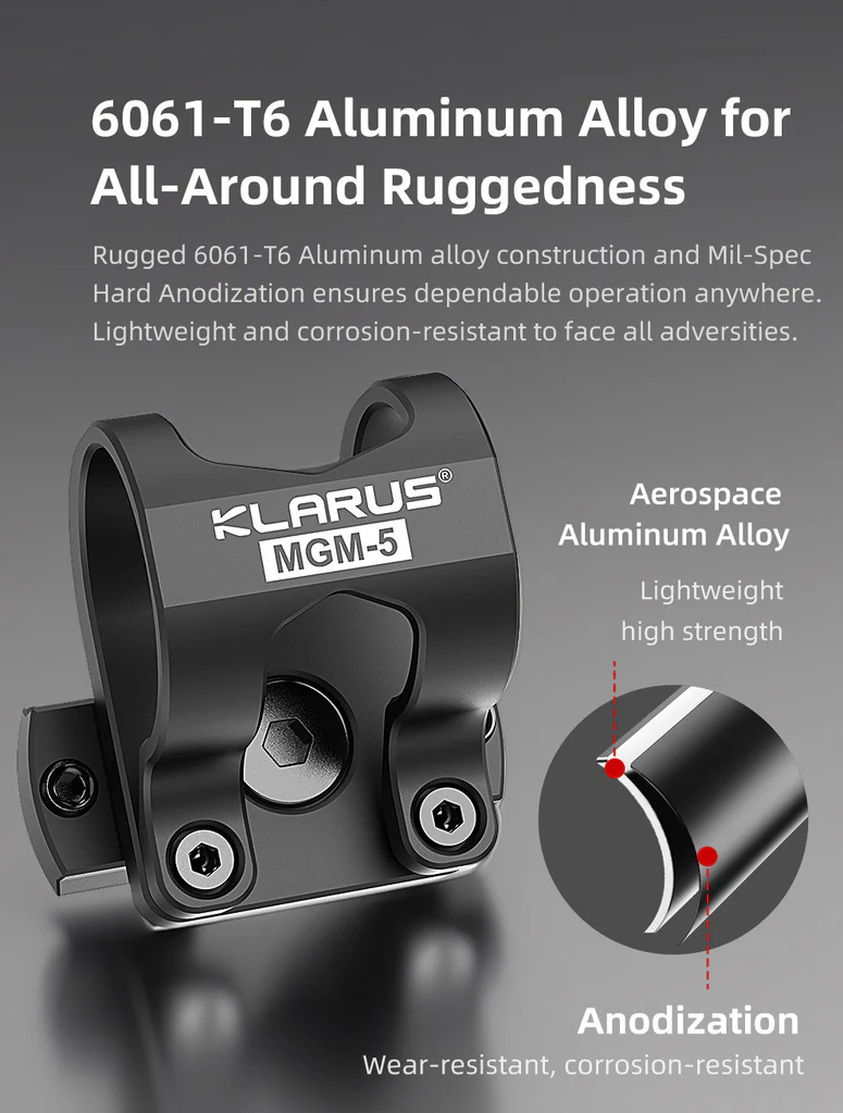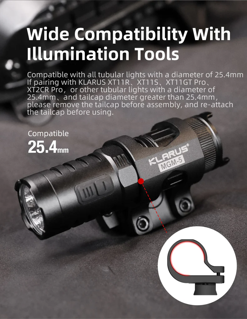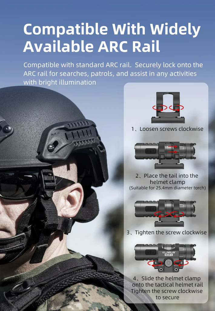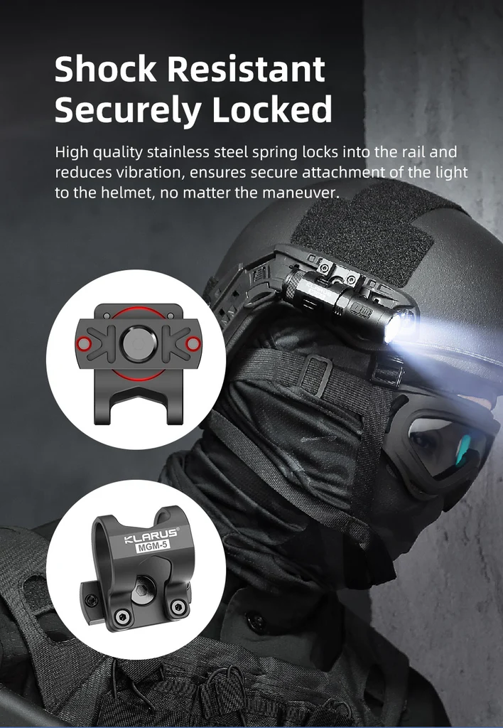 Kask ray sistemlerine tam uyumlu tasarımıyla, XT1C, XTGT11 Pro başta olmak üzere 25 mm gövde çapına sahip çoğu Klarus modeline uygun çalışır.