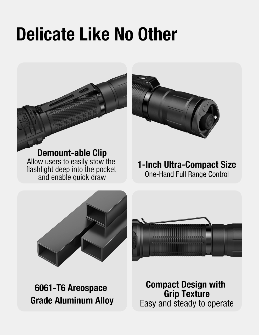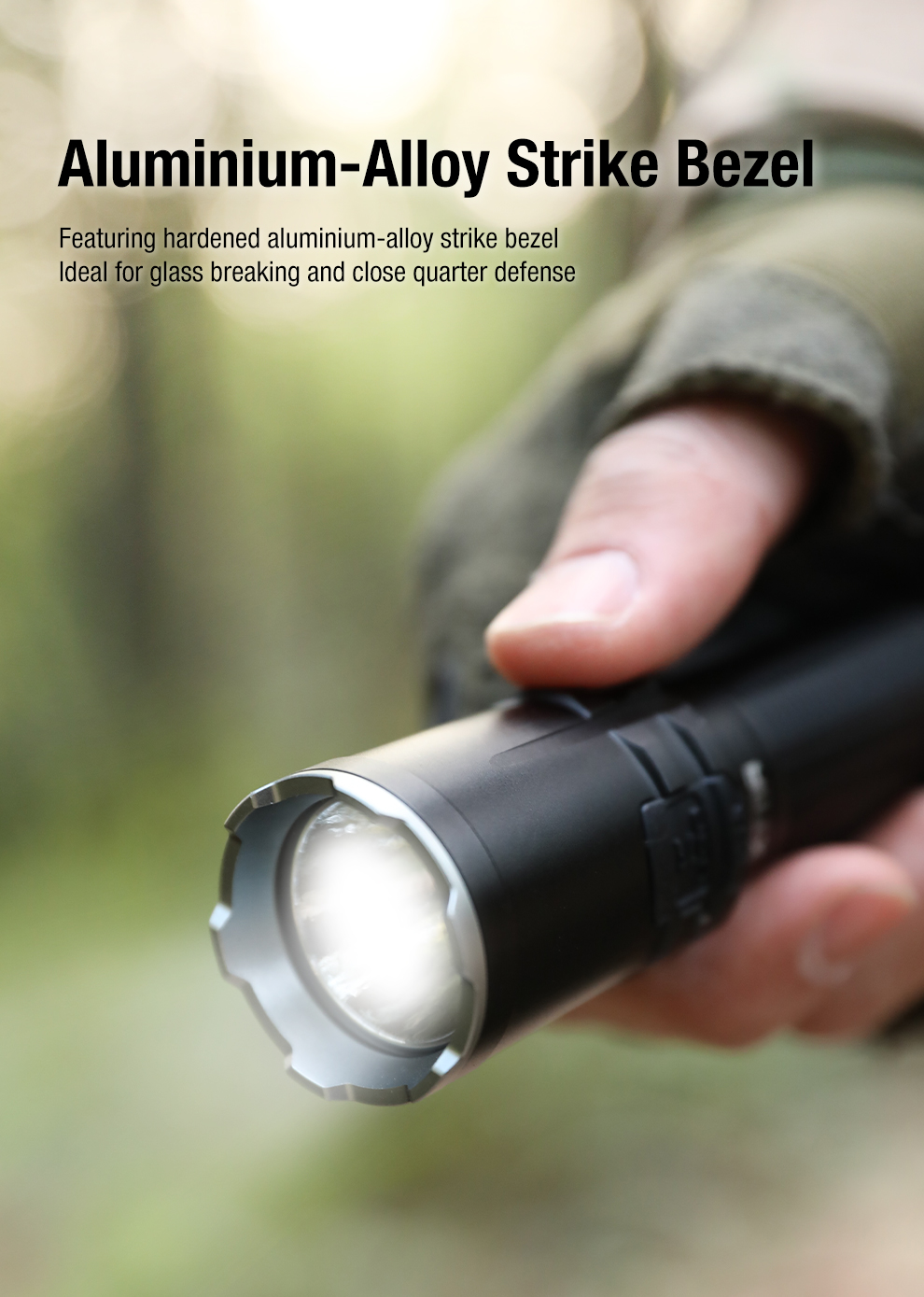 Fener, yüksek performanslı Luminus SST-40 LED ile donatılmıştır. 5 farklı parlaklık seviyesi sayesinde farklı kullanım senaryolarına kolayca uyum sağlar. Taktik kullanım için tasarlanan arka çift anahtar sistemi, acil durumlarda tek dokunuşla strobe moduna erişim sağlayarak hızlı reaksiyon imkanı sunar.