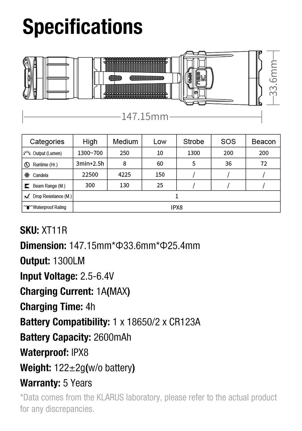 Klarus XT11R, profesyonel kullanım için tasarlanmış güçlü ve güvenilir bir taktik el feneridir. Maksimum 1300 lümen ışık gücü ve 300 metreye kadar aydınlatma mesafesi sayesinde gece şartlarında yüksek görüş sağlar ve outdoor faaliyetler, güvenlik görevleri ve günlük kullanım için güçlü bir aydınlatma çözümü sunar.