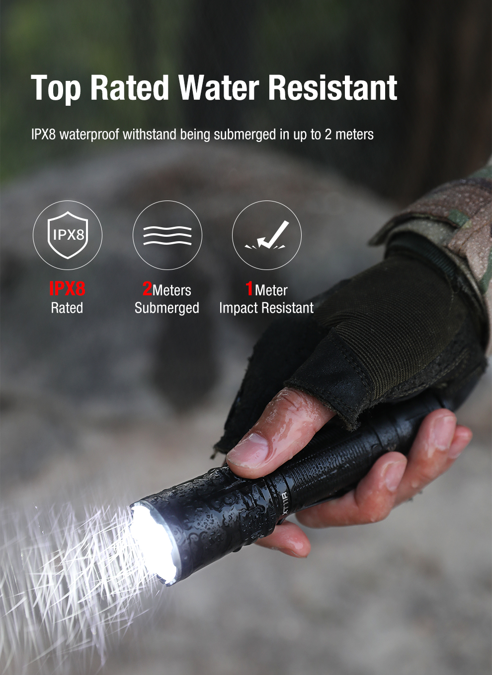 Dayanıklı gövde yapısı ve IPX8 su geçirmezlik seviyesi sayesinde zorlu hava koşullarında güvenle kullanılabilir. Orange-peel reflektör tasarımı ise dengeli ve homojen bir ışık dağılımı sağlayarak hem yakın hem uzak mesafede etkili aydınlatma sunar.