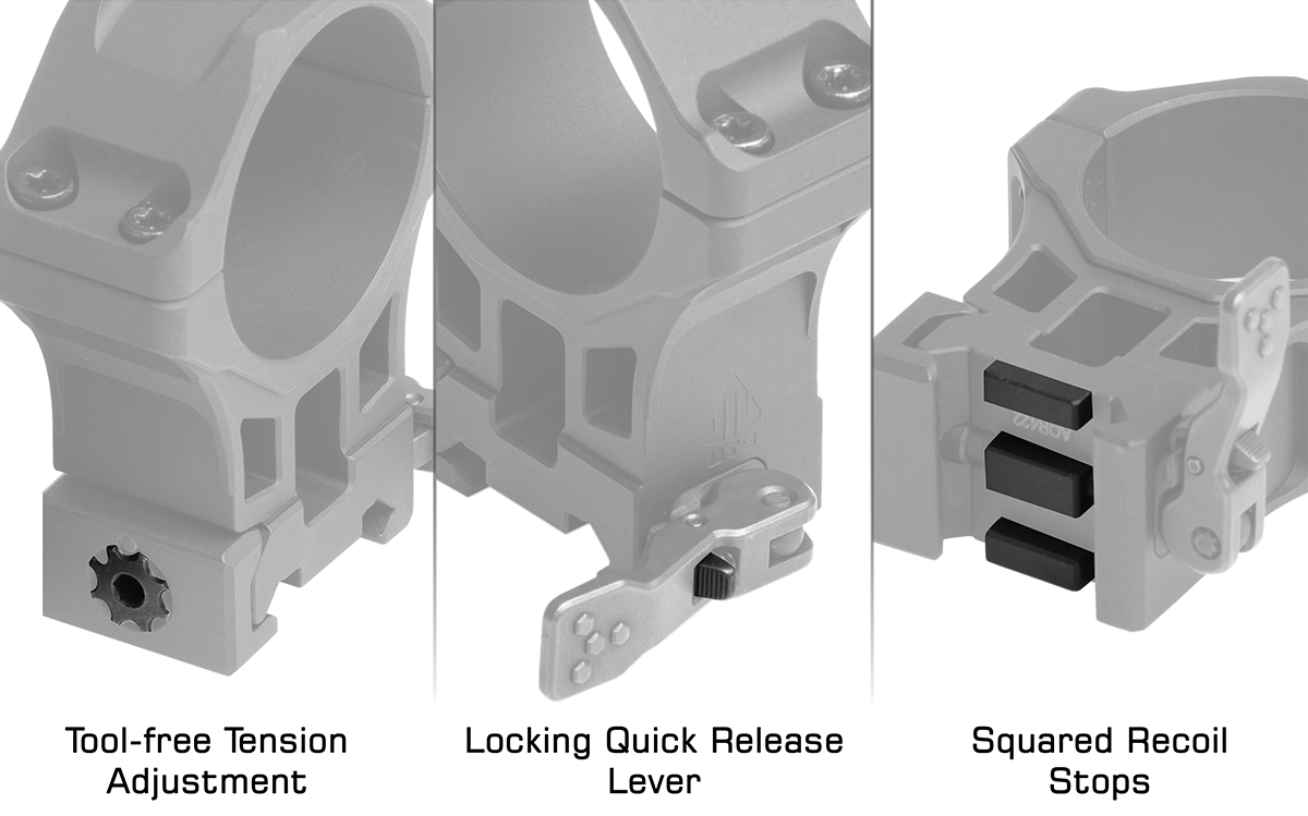Leapers UTG Accu-Sync 34mm, 6061-T6 alüminyumdan hassas CNC işleme ile üretilmiş olup mat siyah eloksal kaplama ile tamamlanmıştır. Genişletilmiş hafifletme oyukları, dayanıklılıktan ödün vermeden ağırlığı ciddi ölçüde azaltır. Yuvarlatılmış kenar ve köşeler; takılma, çizilme veya diğer ekipmanlara zarar verme riskini ortadan kaldırır. Dürbün windage ve elevasyon kulelerine kolay erişim sağlayan ergonomik tasarıma sahiptir. Quick Release (QR) montaj sistemi; aletsiz gerginlik ayarı, kilitli QD kollar ve kare geri tepme durdurucular ile güvenli sıfır tutuşu ve tekrar sıfıra dönüş sağlar. 34 mm tüp çapına sahip dürbünlerle uyumludur ve 78 mm’ye kadar objektif dış çapını destekler. .338 Lapua Magnum kalibreye kadar dayanıklılık derecesine sahiptir.