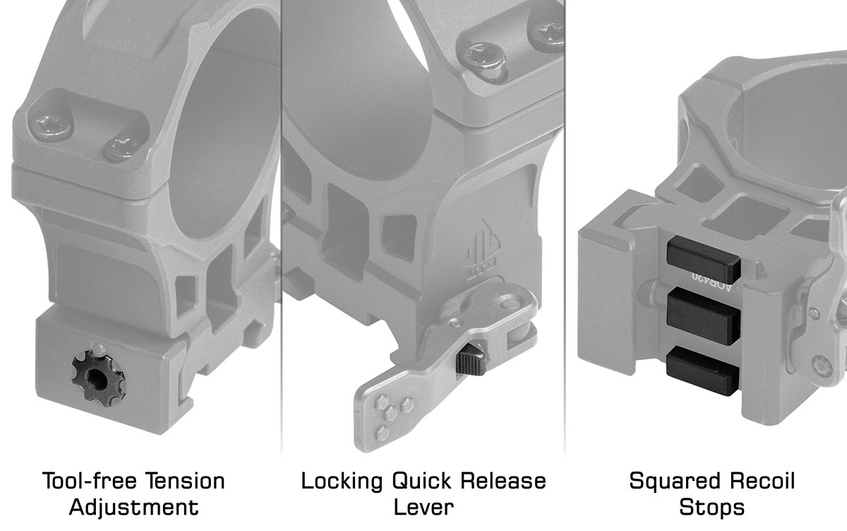 Leapers UTG Accu-Sync 34mm, 6061-T6 alüminyumdan hassas CNC işleme ile üretilmiş olup mat siyah eloksal kaplama ile tamamlanmıştır. Hafifletme oyukları, dayanıklılıktan ödün vermeden toplam ağırlığı azaltır. Tüm keskin kenar ve köşeler yuvarlatılarak güvenli ve takılmasız kullanım sağlanır. Quick Release (QR) montaj sistemi, aletsiz gerginlik ayarı ve kilitli QD kol mekanizması ile güvenli sıfır tutuşu ve tekrar sıfıra dönüş sağlar. Kare geri tepme durdurucular, güçlü geri tepmelerde dahi stabil montaj sunar. 34 mm tüp çapına sahip dürbünlerle uyumludur ve 74 mm’ye kadar objektif dış çapını destekler. .338 Lapua Magnum kalibreye kadar dayanıklılık derecesine sahiptir.